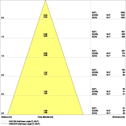 Le code couleur se compose de l'indice de rendu des couleurs (IRC) et de la température de couleur (Kelvin). Le premier chiffre indique le rendu des couleurs (1 = très mauvais rendu des couleurs, 9 = meilleure authenticité des couleurs). Le deuxième et troisième chiffre indiquent la température de la couleur. Exemple : Le code couleur "830" indique que la lampe a un bon rendu des couleurs (8) et une couleur de lumière blanche chaude (30 = 3000K). |