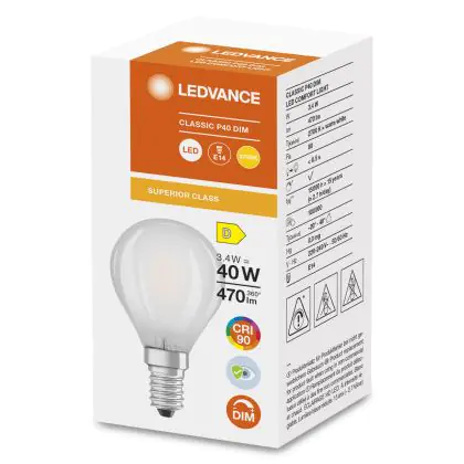 Cette ampoule Ledvance Superior Classic LED E14 Boule Dépolie 3.4W 470lm - 927 | Dimmable - Meilleur rendu de couleur est l’alternative idéale pour la remplacement de votre ampoule classique de 40 W. La technologie LED intégrée vous offrira de nombreux avantages. Les ampoules à incandescence traditionnelles ont une durée de vie limitée. Cette alternative LED vous permettra de profiter d’un éclairage durable et fiable.